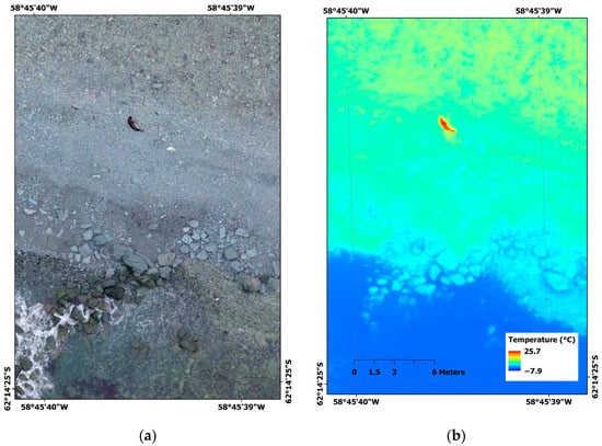 Southern elephant seal (Mirounga leonina) captured by RPAS-based RGB and thermal images in Barton Peninsula, King George Island, Antarctica. (a) Mosaicked RGB image and (b) coregistered mosaicked thermal image to mosaicked RGB image.