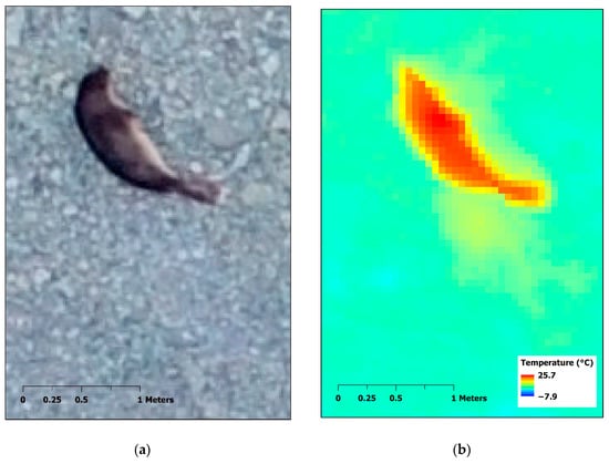 Here, we present an example of retrieving a quantitative feature, the curvilinear overall length [99] of the southern elephant seal, using RPAS-based thermal images acquired in the Barton Peninsula, King George Island, Antarctica. A DJI Inspire V1 with a 12-megapixel Zenmuse X3 RGB camera (DJI Co., Shenzhen, China) and FLIR Vue Pro R thermal-imaging sensor with 13 mm lens (FLIR Systems, Wilsonville, OR, USA) were operated on 4 January 2020 with Pix4D Capture flight planning mobile application (Pix4D S.A., Lausanne, Switzerland). Individual raw radiometric JPEG files from the thermal-imaging sensor were converted to Geotiff format files using FLIR ResearchIR software (FLIR Systems, Wilsonville, OR, USA) for further processing. RGB images and thermal images were mosaicked using Metashape 1.6.2 software (Agisoft LLC, St. Petersburg, Russia) with a spatial resolution of 1.8 and 5.7 cm, respectively; then, the mosaicked thermal image was coregistered to the mosaicked RGB image of finer spatial resolution and higher geolocation accuracy using a georeferencing tool in ArcGIS 10.3 software (ESRI, Redlands, CA, USA) (Figure 4). The seal was clearly identifiable in the thermal image from the background of seashore gravel.