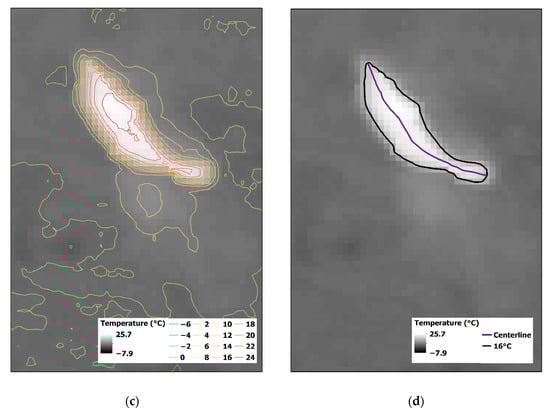 The shape of the seal was recognizable in the thermal image, similar to the higher-resolution RGB image (Figure 5a,b). To retrieve the seal size, temperature contours with 1 °C intervals were delineated as polygons using ArcGIS (Figure 5c). The smallest change in the area of polygons between adjacent temperatures indicating the highest thermal contrast was considered as the threshold temperature, i.e., 16 °C, for determining the boundary of the seal body (Figure 5d). To measure the overall curvilinear length, the centerline of the selected 16 °C temperature polygon was extracted using the Thiessen polygon method [100]. Then, the endpoints of the centerline were extended to vertices at the ends of the polygon to fill gaps. From the extracted centerline, the overall curvilinear length of the target seal was calculated as 170.1 cm, similar to the ca. 180 cm measured in the field using a tape measure.