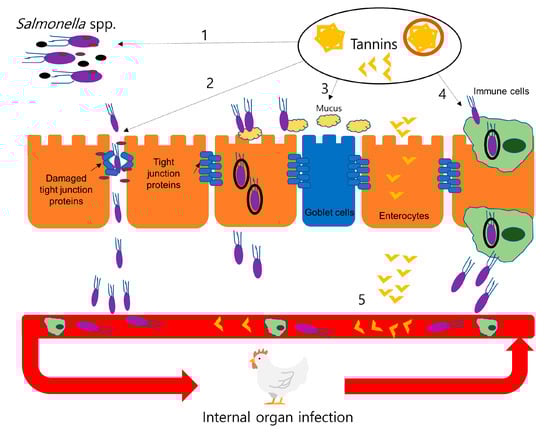 In addition to their antibacterial effects, tannins can control systemic infection of Salmonella spp. by beneficially modulated components of gut ecosystem. Salmonella spp. can enter blood circulation via paracellular and transcellular pathways and use immune cells to enter enterocytes to be distributed in the internal organs and muscles in chickens (Figure 2). Many studies reported that tannins altered expression and functionality of tight junction proteins [68], mucus [69,70], and immune cells [71,72] of chickens. Nevertheless, supplemental tannins have not typically translated to antimicrobial effects against Salmonella spp.in in-vivo studies. For example, while Van Parys et al. [73] reported that whereas HT extract of sweet chestnut woods showed strong antimicrobial effects (minimum inhibitory concentration: 25–50 μg/mL and minimum inhibitory concentration: 100 μg/mL) against S. Typhimurium isolated from pigs under in-vitro conditions, the inclusion of 3000 mg/kg HT in the pig feed did not reduce the Salmonella spp. concentration in feces, intestine and internal organs of pigs inoculated 107 colony forming units (CFU)/mL of S. Typhimurium strain at four days post-inoculum. Similarly, Kubena et al. [51] reported that tannic acid (7.5 or 15 g/kg in the feed) did not modulate the salmonella concentration in cecal content of broiler chickens inoculated with 104 CFU of S. typhimurium. Potential explanations for such findings include (1) tannins were degraded by host or microbial enzymes or absorbed before they reached to the lower intestine where most of the Salmonella spp. and other pathogenic bacteria propagate; (2) tannins formed complexes with components of feedstuffs (polysaccharides and proteins) or endogenous proteins, which inhibits antimicrobial effects of tannins; and (3) experimental factors including the low dosages of tannins, the high dosages of salmonella inoculum or short period of the experiments were possibly obstacles to diminish antimicrobial effects of tannins in in-vivo models [73]. In contrast, Jamroz et al. [74] reported that 1000 mg/kg of sweet chestnut tannins reduced the number of E. coli and coliforms bacteria in the small intestine on 28 d; however, growth performance of the tannin-fed birds was decreased in this study.
