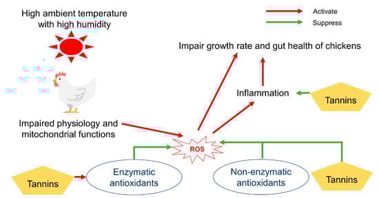 Potential mechanisms for the alleviating effects of tannins in heat-stressed chickens. High ambient temperature with high humidity increase core body temperature of chickens, and this can result in impaired physiology and mitochondrial functions, which lead to excessive reactive oxygen species (ROS) [127]. Tannins, polyphenolic compounds, directly scavenge ROS like non-enzymatic antioxidants [128], and also, tannins can increase activities of antioxidant enzymes such as superoxide dismutase (SOD), glutathione peroxidase (GPX), and glutathione reductase (GR) in broiler chickens. The ROS cause inflammation that can impair growth rate and gut health of chickens and tannins also have anti-inflammatory function [124].