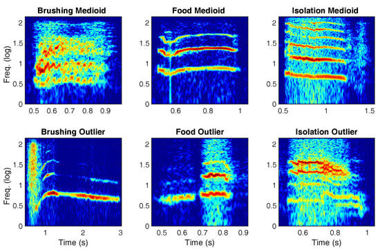 Medioids and outliers were identified by computing three audio features (see [70] for further information about audio features) for each recording, namely the fundamental frequency , the roughness R, and the tristimulus :