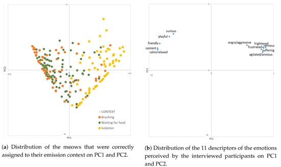A preliminary PCA carried out on the scores given to each descriptor related to the type of emotion perceived by the interviewed participants to the meows emitted in each context revealed no clear separation among the emission contexts (data not presented). The same analysis conducted only on the descriptors of the meows that had been correctly assigned to their context showed a clear trend of meows emitted during brushing to cluster on the left side of PC1, whereas meows emitted in the isolation context are scattered on the right side and those emitted while waiting for food are in an intermediate position, with a trend to cluster on the left (Figure 3a).