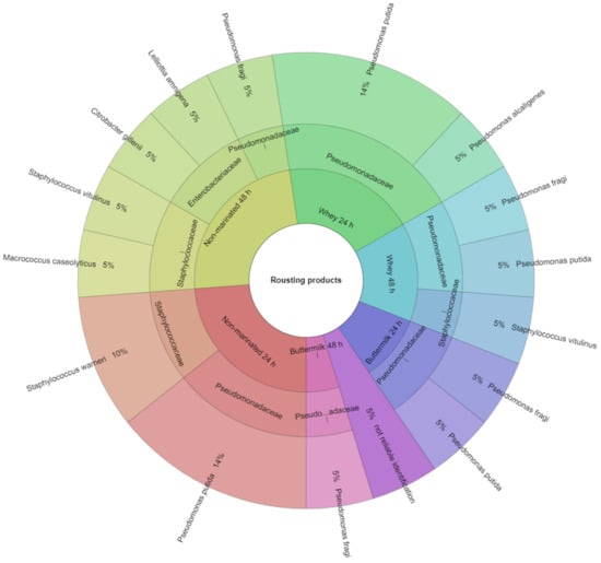 A total of 25 species of bacteria representing 10 families were identified in the study. In this study, only bacteria whose identification result was above 2 were listed. Identification of bacteria isolated from non-marinated and marinated raw breast muscles of hens after the laying period was presented in Figure 1. 74 bacterial colonies were isolated from raw breast muscles before the marinating process, of which 93% were identified. In the Aeromonadaceae family, the most frequently identified bacteria were Aeromonas hydrophila (6%), in the Comamonadaceae family, the Comamonasa aquatica bacteria were the most frequent (1%). The Enterobacteriaceae family was most frequently represented by Enterobacter cloacae (11%). From the Erwiniaceae family, the most frequently identified were Pantoea agglomerans (4%), from the Hafniaceae family, Hafnia alvei (1%). For Micrococcaceae, the most frequently isolated were Kocuria rhizophila (3%) and Rothia endophytica (3%), for Moraxellaceae, Acinetobacter pittii (3%), for Pseudomonadaceae, Pseudomonas alcaligenes (15%). Macrococcus caseolyticus (6%) were the most frequently isolated species in the Staphylococcaceae family. The 24-h marinating in buttermilk and acid whey reduced the number of bacteria. In the raw product marinated with buttermilk, 4 families and 6 species were identified, and in the product marinated with whey, 7 species representing 6 families (Figure 1). Identification of bacteria isolated from non-marinated and marinated roast breast muscles of hens after the laying period was presented in Figure 2. Colonies isolated from roast breast muscles were identified with 95% correct identification. The Enterobacteriaceae family was most frequently represented by Citobacter gillenii (5%) and Lelliota Amnigena (5%), Pseudomonadaceae by Pseudomonas putida (38%), Staphylococcus warnei (10%), and Staphylococcus vitulinus (10%) were the most frequently isolated species in the Staphylococcaceae family. In a non-marinated product treated with the roasting process, 7 species from 3 families were identified, while in a roast product marinated with buttermilk for 24 h, only 2 species of bacteria representing 1 family were identified. After marinating with whey, the same effect was obtained. In a roast product marinated with buttermilk for 48 h, 1 species of bacteria was identified and with whey, 3 bacteria species from 2 families were identified (Figure 2). In the study, Kačániová et al. [] and Kačániová et al. [] showed a positive effect of the use of essential oils on inhibition of bacterial growth. Similar results were obtained in studies on poultry meat after marinating in natural marinades containing lactic acid bacteria in its own study.