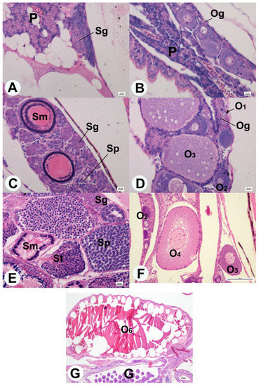 The cross-section of guppy gonad stained hematoxylin-eosin in age: 1 dph (A,B), 60 dph (C,D), and 360 dph (E–G). Localization of spermatogonia (Sg), spermatocytes (Sp), spermatids (St), and spermatozoa (Sm) in the cross-section of the testis (A,C,E). Localization of oogonia (Og) and oocytes stages: O1, O2, O3, O4, O6 in cross-section of ovaries (B,D,F,G). P—pancreas; G—embryo’s gills. Scale bars: (A–E)—10 μm; (F,G)—100 μm.