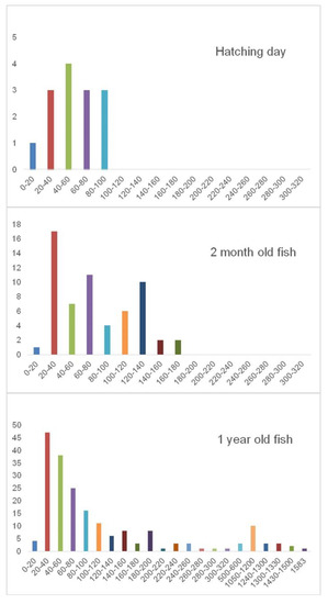 Distribution of guppy oocyte diameter on age 1, 60, and 360 dph. Vertical axis—number of oocytes, horizontal axis—oocyte diameter classes (µm).