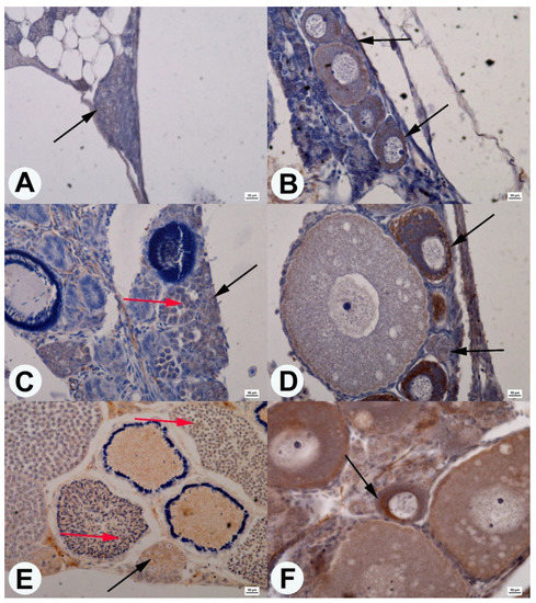 Another factor that may influence teleosts’ sex may be the modulation of metabolic pathways regulated by various sex hormones, as in other vertebrates [36]. It has been found that estrogens in fish play a role in accumulating yolk in growing oocytes (vitellogenesis) and are involved in sex differentiation [37]. Nuclear receptors, including the estrogen receptor, are involved in estrogens’ response at the cellular level [38]. In guppies, the estrogen receptor β (Erβ) was observed in both the male and female gonads. In the examined fish of both sexes, Erβ showed a positive reaction within the endothelium of blood vessels, and only in the ovaries, the presence of Erβ positive areas in interstitial tissue was observed. This may suggest a more significant role of this receptor in determining the female sex by estrogens signal transduction, female sex hormones, and regulating the process of vitellogenesis. As indicated by [39], guppy’s estradiol content increases during vitellogenesis and drops abruptly after fertilization. The re-increase in this hormone’s content is found during advanced pregnancy when new oocytes are recruited. Examined females at 60 dph, only oocytes were observed in the ovary in which there is no yolk deposition in the cytoplasm (up to the stage O4). Therefore, a higher level of Erβ detection in the ovaries of the examined guppies was found on the last day of the experiment, when oocytes were also observed in the ovarian parenchyma at various deposition stages yolk plaques in the cytoplasm.