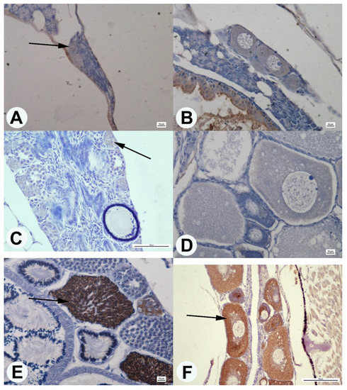 Cross-section of guppy testis (A,C,E) and ovaries (B,D,F) in age 1 dph (A,B), 60 dph (C,D), and 360 dph (E,F). Localization of the Dmrt1 protein (black arrow) in the cytoplasm of spermatogonia (A,C,E), spermatids (E), and oocyte in ovaries fish in age 360 dph. Anti-Dmrt1 antibody staining. Scale bars: (A,B,D,E)—10 μm; (C)—50 μm; (F)—100 μm.