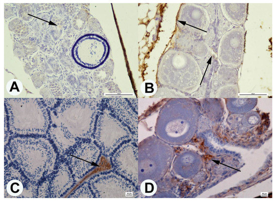 Cross-section of guppy testis (A,C) and ovaries (B,D) in age 60 dph (A,B) and 360 dph (C,D). Localization of the Erβ protein (black arrow) in the endothelium of blood vessels and interstitial tissue of gonads. Anti- Erβ antibody staining. Scale bars: (A,B)—50 μm; (C,D)—10 μm.