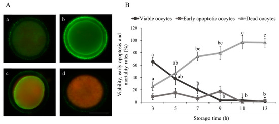Effect of ovary storage time (3 to 13 h) on live/dead status and early apoptosis of immature sheep oocytes. (A) Representative images of sheep oocyte classification using Annexin-V staining: (a) viable oocyte, (b) early apoptotic oocyte and (c,d) dead oocytes. Scale bar = 50 µm. (B) Viability and early apoptosis rates (%): results are expressed as mean ± SEM. a,b,c Different letters indicate differences (p ≤ 0.05) among storage times.