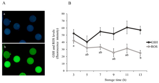 Effect of ovary storage time (3 to 13 h) on intracellular glutathione (GSH) and reactive oxygen species (ROS) levels of immature sheep oocytes: (A) representative images of intracellular (a) GSH and (b) ROS oocyte levels, scale bar = 100 µm, and (B) fluorescence intensity of GSH and ROS levels. Results are expressed as mean ± SEM. a,b Different letters indicate differences (p ≤ 0.05) among storage times.