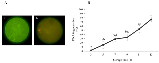 The number of immature sheep oocytes with TUNEL-positive fragmented DNA was lower (p < 0.05) at 3 h (1.94 ± 5.48%) of ovary storage, increased from 7 h (28.91 ± 5.48%) and recorded a maximum value at 13 h (75.88 ± 5.48%; Figure 3B).