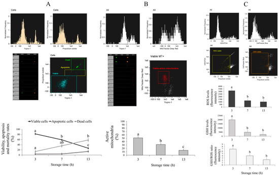 After maturation, COCs collected from ovaries stored for 3, 7 and 13 h were gently pipetted and detached cumulus cells were analysed by flow cytometry. Live/dead status, apoptosis, active mitochondria, and GSH and ROS levels were assessed. The results showed reduced (p < 0.05) cell viability as time increased (3 h = 82.06 ± 3.87% vs. 7 h = 59.16 ± 3.87% vs. 13 h = 26.53 ± 3.87%; Figure 4). Moreover, there was a lower (p < 0.05) percentage of dead cells at 3 h compared to 13 h (13.72 ± 6.08% and 58.50 ± 6.08%, respectively), although apoptosis did not show significant differences between storage time (p > 0.05; Figure 4).