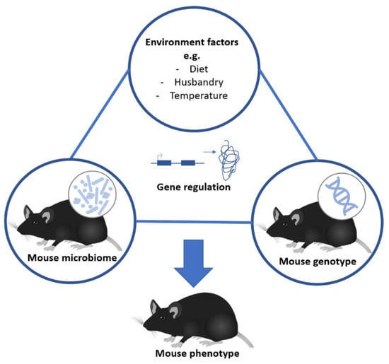 Variation in the mouse microbiome influences host phenotype, but it remains unclear how this fits into the traditional phenotype-genotype-environment model [,]. Here, we assume the mouse phenotype is influenced by mouse genome, the environment and the microbiome as separate components, and most importantly by complex interactions between these components []. This is illustrated in Figure 1. These interactions can explain why mice might respond completely differently to an intervention in one study compared to another.