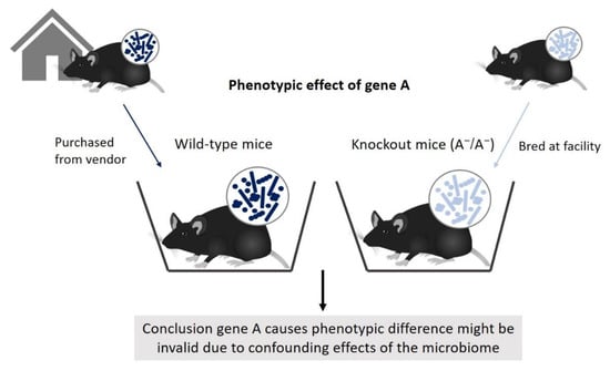 The inter-individual variation in the microbiome composition of mice can be a source of bias in experimental designs. In much of biomedical experimental research, researchers try to identify a cause and effect between two variables. In mouse experiments, this usually involves studying the effect of an independent variable on a phenotypic trait of mice, using one (or more) experimental group(s) and a control group. However, the phenotypic difference between the groups of mice might be caused by variation in the microbiome instead of the independent variable under study, or by complex interactions between the microbiome and the study variable. To illustrate this confounding effect, Stappenbeck and Virgin describe problems arising from breeding one group of mice (e.g., mutants) at the research institute and purchasing the wild-type control group from a vendor outside the institute []. This is bad practice for several reasons, but specifically the difference in microbiome composition resulting from separate breeding puts the comparison between two groups at risk of bias [], as is illustrated in Figure 2.