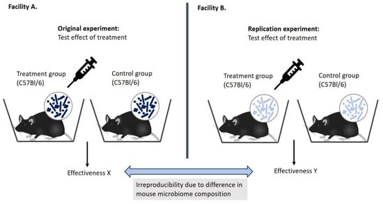 Already in 2016, Stappenbeck and Virgin expressed their view that the irreproducibility of studies using mice with a genetically identical background might be ascribed to variation in the host-associated microorganisms []. The belief that microbes influence the reproducibility of study results received more attention because of an empirical study in Nature Microbiology. This study revealed that the variation in susceptibility to Salmonella infection of genetically similar mice purchased from different vendors could be attributed to variation in their microbiomes []. Subsequently, an article appeared in The Scientist with the alarming title “Microbes May Take Some of the Blame for the Reproducibility Crisis” [].
