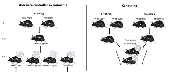 The most well-established and easy method to control for microbiome effects is cohousing at weaning. Individual mice from experimental and control groups are housed together in a single cage. This should eliminate the microbiota cage-effect [,]. To ensure more homogenization across cages, the transfer of bedding material could supplement cohousing. Another well-acknowledged method to control for microbiome effects is designing littermate-controlled experiments. This is particularly useful when testing the effect of a gene knock-out (or mutant) versus control. The breeding between knock-out and control mice leads to heterozygous offspring in the first generation, and homozygous littermates in the second generation. Comparison between these knock-out and their control littermates controls for the effects of the microbiome []. Both methods are shown in Figure 4. In 2019, a study compared the two methods and concluded that littermate-controlled experiments were more effective in standardizing microbiome composition across groups compared to experiments in which mice were cohoused [].