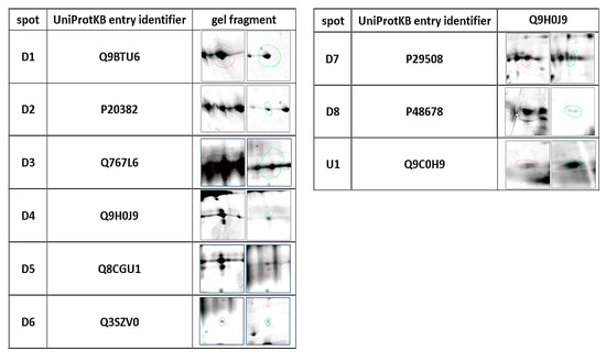 Our study revealed 489 common tear film proteins from the diabetic and control group. From these proteins 14 have shown statistically significant different expression (p ≤ 0.05), and so they were excised from the electrophoretic gel. From these 14 tear film proteins, 9 were positively identified by MALDI-TOF MS. Table 2 contains the list of the positively identified proteins, along with their names, genes, and UniProt base accession numbers. With the Delta2D program, eight of the nine proteins were assigned to downregulated, and one of the nine proteins were assigned to upregulated (Table 2, Figure 1). Figure 1 shows representative two-dimensional electrophoresis gel spots of significantly (p ≤ 0.05) differentially expressed proteins in the control group versus the diabetes group. Figure 2 shows a fused image of the condensed electrophoretic gels from the whole experiment. Ratio—quotient of the group means of relative spot volumes: volume of a given spot in the control group is the denominator of the ratio parameter (Rt > 1.5 overexpression, Rt < 0.67 suppression). To further evaluate the nine differentiating proteins, the Panther program (http://www.pantherdb.org) was used to assign them to the appropriate biological process. One protein was identified as upregulated: SRC kinase signaling inhibitor 1 (SRCIN1), and eight proteins were found to be downregulated: phosphatidylinositol-4 kinase type 2 alpha (PI4KIIα), Pro-melanin concentrating hormone (Pro-MCH), Flotillin-1, Protein mono-ADP ribosyltransferase, GRIP and coiled coil domain containing protein 2, tetratricopeptide repeat protein 36, serpin, and Prelamin A/C.