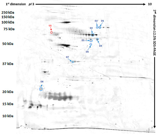 Fused image showing the condensed spot patterns from the experiment. Downregulated proteins are marked in blue while the upregulated proteins are marked in red.