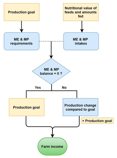 The algorithm estimates the average daily metabolizable energy, digestible undegraded true protein and effective rumen degradable protein intake of the different animal categories based on the energy and protein in feeds, respectively, and the estimated dry matter appetite of animals. The microbial crude protein intake is also estimated using Equation (3):