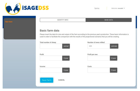 Figure 3. Creation of farm—farm basic data; users provide useful information for the recent production period (costs refer to the variable costs of the farm). - Access/Create scenarios: Within their farm, users can have access to their existing scenarios (for editing or viewing results) and they can create new ones.