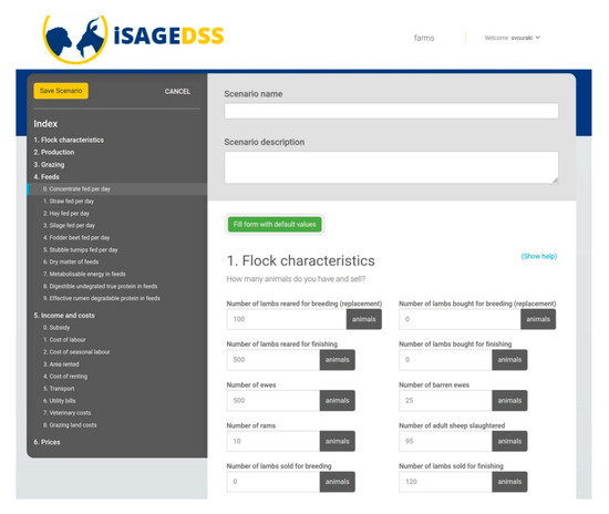 - Scenario data input: In their new scenario, users have to input information regarding all important farm aspects; flock characteristics, production, processing (only in dairy sheep and goat farms), grazing, feeds, income and variable costs (without value added tax) and farm prices. Easy navigation through the different categories is provided by the “index option”. Users can use the “Show help” option in order to be provided with further explanations for each of the required data. This option ensures methodological homogeneity for data provision. Moreover, they can also use the “fill form with default values” option to save time in case they wish to test an average management scenario or they are interested in changing only a few parameters (Figure 4).