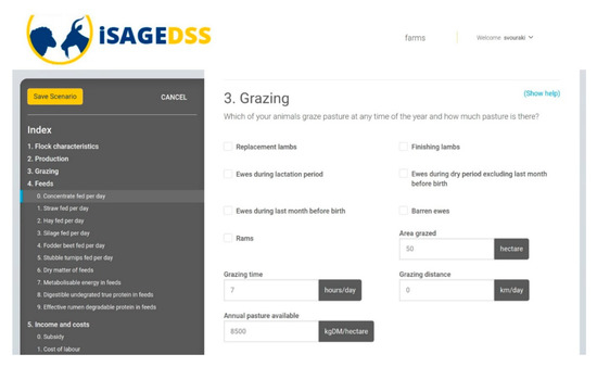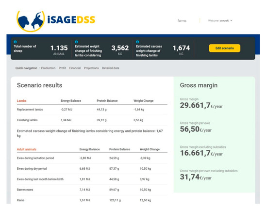 Contrary to all the above, iSAGEDSS offers projectional capabilities for decision-making with an emphasis on profitability and productivity, while considering grazing management. To the best of our knowledge, only PASTOR-DSS, a decision support system for dairy sheep farming, allows for bio-economic simulations. However, since simulations rely on an individual animal models, its use is impaired by the large number of required input animal parameters [22]. Although iSAGEDSS takes into account all important farm aspects, great effort was put into limiting the number of input variables to those absolutely required and, therefore, the time investment for the farmer; the input data form can be completed in approximately 30 min and the report is generated in seconds. Moreover, since it is designed for annual farm management planning, it has a low frequency of use, with expected updates once per year, ideally prior to the next production period. At the same time, the fact that it is an online (cloud-based) web application with a user-friendly interface and visual presentation of results further differentiates iSAGEDSS from most of the existing sheep and goat management tools and can help towards increasing adoption rates [24,25].