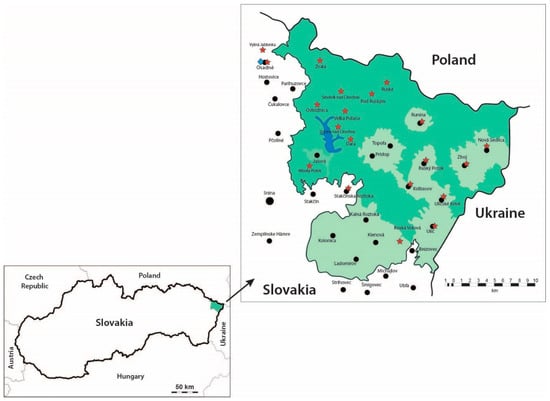 - Štofík, J.; Buraľ, M.; Paule, L.; Straka, M. Zhodnotenie historického rozšírenia medveďa hnedého (Ursus arctos) v Bukovských vrchoch a na priľahlých územiach [Evaluation of the historical distribution of the brown bear in the Bukovské vrchy and in the adjacent areas]. Natura Carpatica 2010, 51, 65–74. (In Slovak) [Google Scholar]