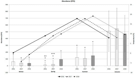 | Season | Year | Number of Examined | Number of Infected | Minimum EPG | Maximum EPG | Abundance (EPG ± SD) | Mean Intensity of Excretion (EPG ± SD) | Prevalence (%) 95% CI |