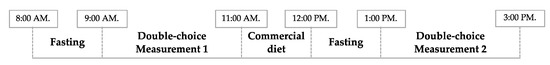 Figure 1 shows the feeding protocol [36]. In brief, after an hour of fasting, two test-containers, each one filled with 100 g of one of the experimental feeds, were fixed side-by-side to the front of each cage. Feed intake was measured for the following 120 min. This procedure was repeated twice daily. In order to avoid bias, the position of the test-containers was switched from one measurement to the next. Between the two measurements, birds were offered a commercial diet for the first 60 min and fasted during the next 60 min before the start of the second test of the day.