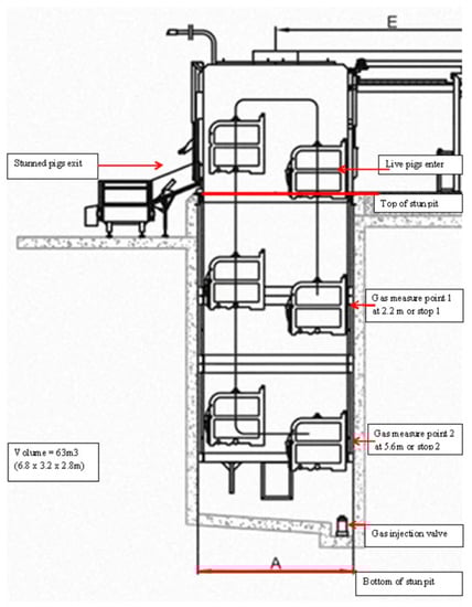 Exposure of pigs to hypercapnia (high concentrations of carbon dioxide (CO2)) is a predominant method for stunning at commercial slaughter. Positive aspects of the system allow small groups of pigs to be efficiently moved towards the stunning unit using mechanical push gates, which minimizes the handling stress involved with human contact. Allowing pigs to remain in groups during preslaughter handling and stunning also respects the natural herd instincts in pigs to remain in social contact with one another, thereby minimizing fear and stress caused by isolation and close human contact, often associated with electrical stunning. Close human contact and restraint of pigs individually during stunning has been associated with causing preslaughter handling stress and meat quality defects, such as pale, soft, and exudative (PSE) and blood splash [1,2].