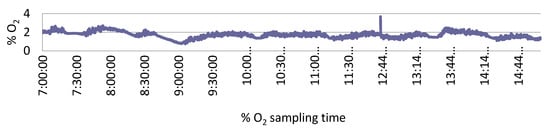During 90C stunning, CO2 concentrations remained at 81.6 ± 0.76% at the first stop (2.2 m down) and 92.2 ± 1.32% at the bottom (5.6 m down), and the O2 concentration was always under 2% in both sampling points. During 20C2O stunning, N2, CO2, and O2 concentrations were 81.0 ± 0.34%, 17.3 ± 0.44%, and 1.29 ± 0.33% at the first stop and 81.3 ± 0.37%, 17.4 ± 0.41%, and 1.3 ± 0.28 at the second stop, respectively. However, gas concentrations fluctuated at 2.2 m and 5.6 m sampling points, as shown in Figure 2.