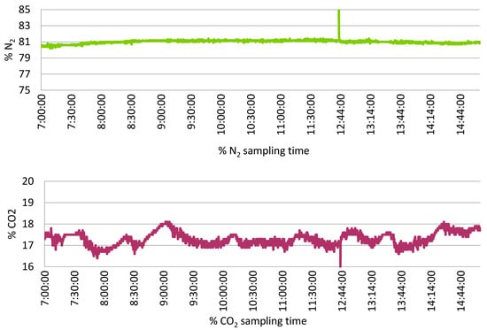 Oxygen (O2), nitrogen (N2), and carbon dioxide (CO2) concentrations at the bottom sampling point (5.6 m down), during the 20C2O gas stunning batch. The spike observed at 12:44 min corresponds to variation of gas concentration during the lunch break. After the break, slaughter did not start again until gas concentrations were restored.
