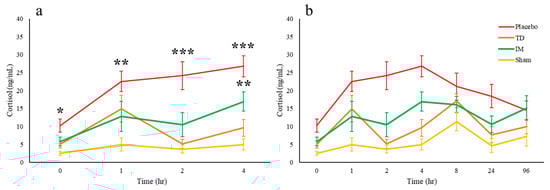 Plasma cortisol concentrations (ng/mL) changes (mean ± SD) at 0–4 h (a) then to 96 h (b) after dehorning in cattle treated with placebo (n = 10), TD ketoprofen (n = 10; 10 mg/kg), IM ketoprofen (n = 10; 3 mg/kg), compared to a sham group that were not dehorned (n = 6). Significant differences of p < 0.05 (*), p < 0.01 (**) or p < 0.001 (***).