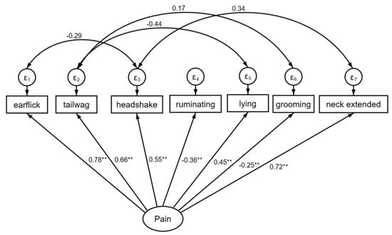 Line plot showing Structural Equation Modelling and Confirmatory Factor Analysis conceptual map depicting the association between calves’ behavioural variables (fitted as measured predictor variables) and pain response (fitted as a latent variable). ** p < 0.001.