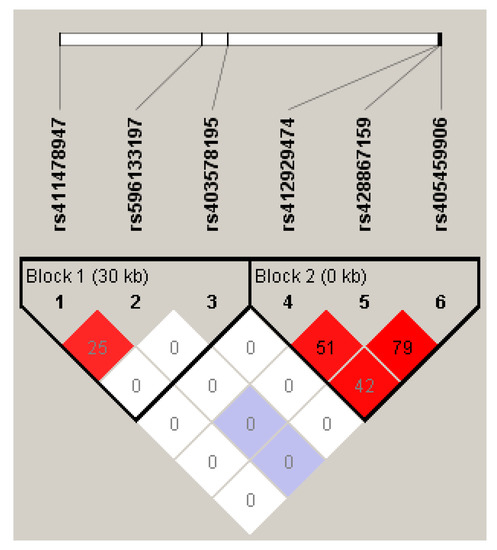 - Barrett, J.C.; Fry, B.; Maller, J.; Daly, M.J. Haploview: Analysis and visualization of LD and haplotype maps. Bioinformatics 2005, 21, 263–265. [Google Scholar] [CrossRef] [PubMed]