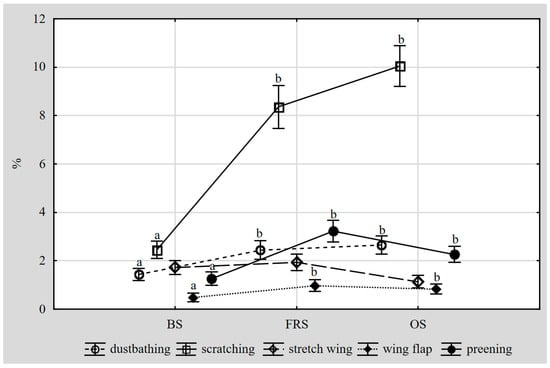 Percentage of different forms of comfort behaviour in the studied housing systems Explanations: housing system: BS—barn deep-litter system, FRS—free-range system, OS—organic system; a, b—values with different letters within the form of behaviour differ significantly at p < 0.05.