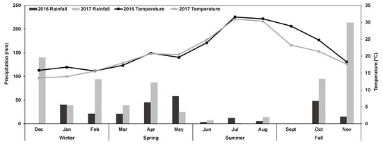 The study was carried out for two consecutive years in the Rif region of Northern Morocco. The climate is of Mediterranean type, characterized by seasonal contrast, pre-humid in mountainous areas (rainy and cold in winter and mild in summer), and humid in winter and dry in summer in the plain. Mean annual rainfall is around 700 mm, with a daily temperature range of 3–14 °C (minimum) and 18–38 °C (maximum) [9]. The two experimental years were very contrasted regarding the mean annual rainfall, with 270 and 755 mm in 2016 (dry year) and 2017 (wet year), respectively (Figure 1).