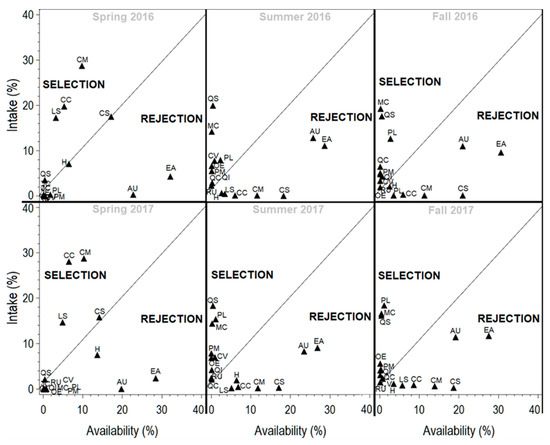 Seasonal selection vs. rejection of plant species consumed by goats browsing a Southern Mediterranean forest rangeland during 2016 and 2017. AU: Arbutus unedo; CC: Cistus crispus; CM: Cistus monspeliensis; CS: Cistus salviifolius; CV: Calicotome villosa; EA: Erica arborea; H: Herbaceous; LS: Lavandula stoechas; MC: Myrtus communis; OE: Olea europaea; PL: Pistacia lentiscus; PM: Phillyrea media; QC: Quercus canariensis; QI: Quercus ilex; QS: Quercus suber; RU: Rubus ulmifolius.