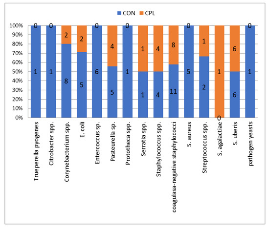 Number and percentage of causative pathogens isolated in the clinoptilolite (CPL) supplemented group (udder quarters n = 29) and in not treated group (control (CON)) (udder quarters = 57).