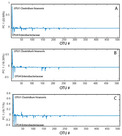 Data compression with the principal coordinates analysis (PCoA) showed similar loading patterns for before, after, and changes from before to after the race (Figure 2). In all cases, the main pattern was that Clostridium hiranonis showed a strong negative association with Enterobacteriaceae.