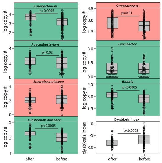 Bacterial taxa included in the dysbiosis index. The dysbiosis index was calculated as the sum of the log10 copy number for bacteria positively associated with the dysbiosis index (marked in red), while subtracting those negatively associated (marked in green). The association with dysbiosis has previously been determined [6]. Abbreviations: after—after the race, before—before the race.