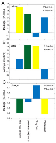 Bacterial loadings before the race (A), after the race (B), and changes from before to after the race (C). The bacterial loadings were derived from the first principal component in a PCoA model for the mean-centered operational taxonomic unit (OTU) table.