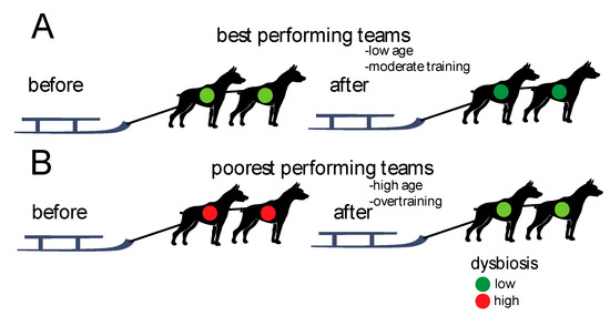 Increased damage and oxygen leakage in the guts of the dogs participating in teams performing less well may lead to a greater growth potential of dysbiosis-associated bacteria. In order to prevent dysbiosis, we hypothesize that the dysbiosis-associated bacteria must be suppressed by a concordant increase in normobiosis-associated bacteria. This provides a potential explanation for the apparently contradictory results, with the teams performing less well showing the greatest decrease in dysbiosis after the race.