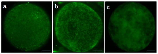 Oocytes after IVM for 42 h were selected randomly from the control group and melatonin group, and were incubated in pre-warmed maturation medium at 39 °C and 5% CO2 for 20 min. A Mito Tracker Green kit (Beyotime Institute of Biotechnology, Haimen, China) was used to label distribution of mitochondria of oocytes at 37 °C for 30 min. The labeled oocytes were checked using a fluorescence microscope (Olympus, BX60, Tokyo, Japan), and all oocytes were photographed using a digital camera (Nikon 990, Tokyo, Japan). There were two main distribution features of mitochondrial distribution patterns in oocyte: one was that labeled mitochondria were distributed evenly throughout ooplasm (homogeneous, Figure 1a), which indicated that mitochondrial distribution was better in oocytes. Others were that the labeled mitochondria were distributed unevenly within ooplasm (heterogeneous; Figure 1b,c) as described previously [19]. The abnormal distribution of mitochondria has negative effects on ATP distribution and embryogenesis [20]. The value of mitochondrial distribution was analyzed in a blind manner, and was determined as the number of oocytes with homogeneous mitochondria/total number of the oocytes × 100.