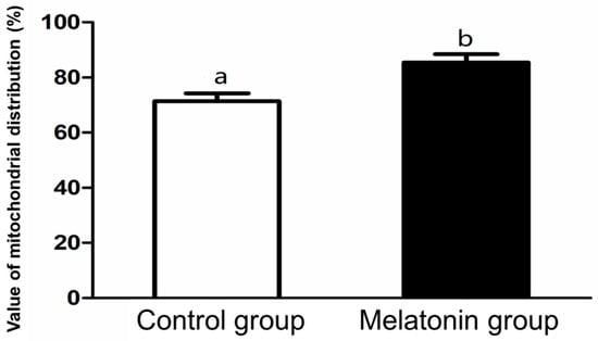 Effect of melatonin addition on the value of mitochondrial distribution in porcine oocytes after in vitro maturation. High value indicates that mitochondrial distribution in oocyte is more homogeneous. Different superscript letters within the different column indicate significantly different (p < 0.05).