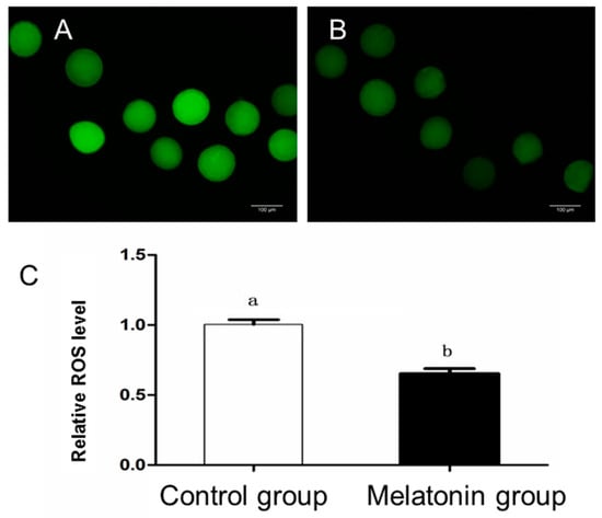 Effect of melatonin on reactive oxygen species (ROS) level of oocytes after in vitro maturation. (A) Representative image of ROS level in the control group. (B) Representative image of ROS level in the melatonin group. (C) The relative ROS levels in the control group and melatonin group. Different letters in the different column represent significant difference (p < 0.05). Bar = 100.