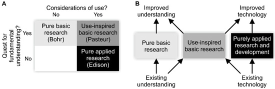 An alternative and useful classification was provided by Stokes in what he called Pasteur’s quadrant [18]. Stokes based the classification of research on two questions in a 2 × 2 matrix (Figure 1A). The “use-inspired basic research” in Stokes’ classification is considered as equivalent to the “oriented based research” according to the definition in the Frascati Manual [17]. Use-inspired basic research may bridge the gap between basic and applied research (Figure 1B).