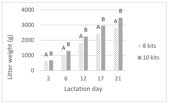 The study was conducted on a commercial rabbit farm located in Central Poland. The study was conducted on a commercial rabbit farm in which an artificially controlled environment (temperature of 16–18 °C, humidity 60%) was created. The farm was prepared to house a maximum number of 500 does (400 does were on the farm during the examination period). A total of 32 does of the maternal Hycole line (GP C males x GP D females) were randomly selected from females of the same age (28 w). The females were selected during the standardization of litters conducted after their second parity. The does were housed individually in wire cages and fed ad libitum with a commercial pelleted feed (17.5% crude protein, 14% crude fiber, 8% ash, 4.2% total fat). The animals had free access to water provided by the automatic watering system. On the first day postpartum, the litters were standardized to 8 kits per litter in 16 nests (in these nests, the number of born kits was lower or equal to 9) and 10 kits per litter in 16 nests (in these nests, the number of born kits was equal to or exceeded 10). From the first day to the 14th day, the nests were opened only once daily, allowing the mothers to feed their kits for about 8–10 min. On the 14th day of lactation, the females were artificially inseminated. After insemination of the does, the nests were opened, allowing the kits unlimited access to the mother, to the solid feed (the pelleted feed for nursing does), and to water. For the sake of research, two exceptions were made. The kits were separated from their mothers from 9:00 on day 16, until 9:00 of day 17, and from 9:00 on day 20 to 9:00 on day 21 of lactation. During this period, the kits had free access to feed and water. The weight of does and their litters was controlled with a PM 15.4Y precision balance (RadWag, Poznań Poland). One kit from each litter was marked with a spray for marking livestock to control its body weight throughout the lactation. The kit was selected randomly from each litter; finally, 32 kits were controlled—16 from nests containing 8 kits and 16 from nests containing 10 kits. On days 2, 6, 12, 17, and 21 of lactation, body weight of females, daily milk production, litter weight, and weight and milk intake of one kit per litter were collected. Kit/litter weight gain up to the 21st day of lactation was calculated from the difference between the body weight of one marked kit/litter on day 21 post-partum and the body weight of one marked kit/litter on day 2.