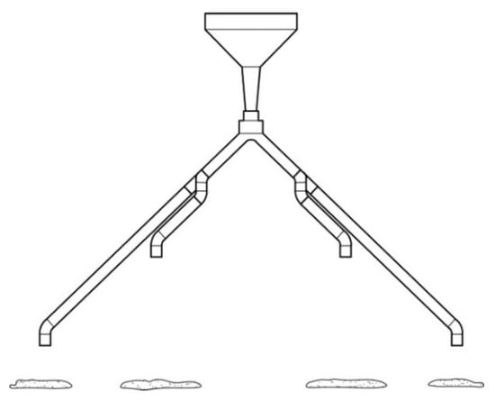 The larvae dispenser used during the study was also supplied by Protix B.V. (Dongen, The Netherlands). Design of the dispenser is indicated in Figure 1. The larvae dispenser was designed such that approximately 275 g of live larvae could be dispensed from the four exits of the dispenser (equally and randomly) during a 6 h period. The dispenser consisted of a buffer that stored required amounts of larvae for one day of feeding. Larvae gradually fell from the buffer into the dispenser unit which further bifurcated the larvae into one of the four discharge points. The size and volume of the dispenser was designed keeping in mind the number of hens (so that every chicken got the same proportion of larvae) and dimensions of the pen.